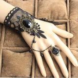 Intricately designed black lace pairs beautifully with gleaming teardrop pendants and vintage-style chains. The matching ring connects to the bracelet with a fine metal link, creating a cohesive look that’s elegant and just a little dangerous. Whether worn as a full set or styled separately, each piece adds a beautifully dark flourish.