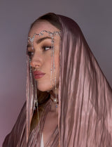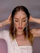 Lovingly handmade, this headpiece features crystal-clear rhinestones arranged along a dainty chain that drapes effortlessly across the forehead. The symmetrical design and tiara-inspired placement create a soft, regal silhouette—perfect for boho brides, fairy-tale weddings, or romantic photo shoots.
